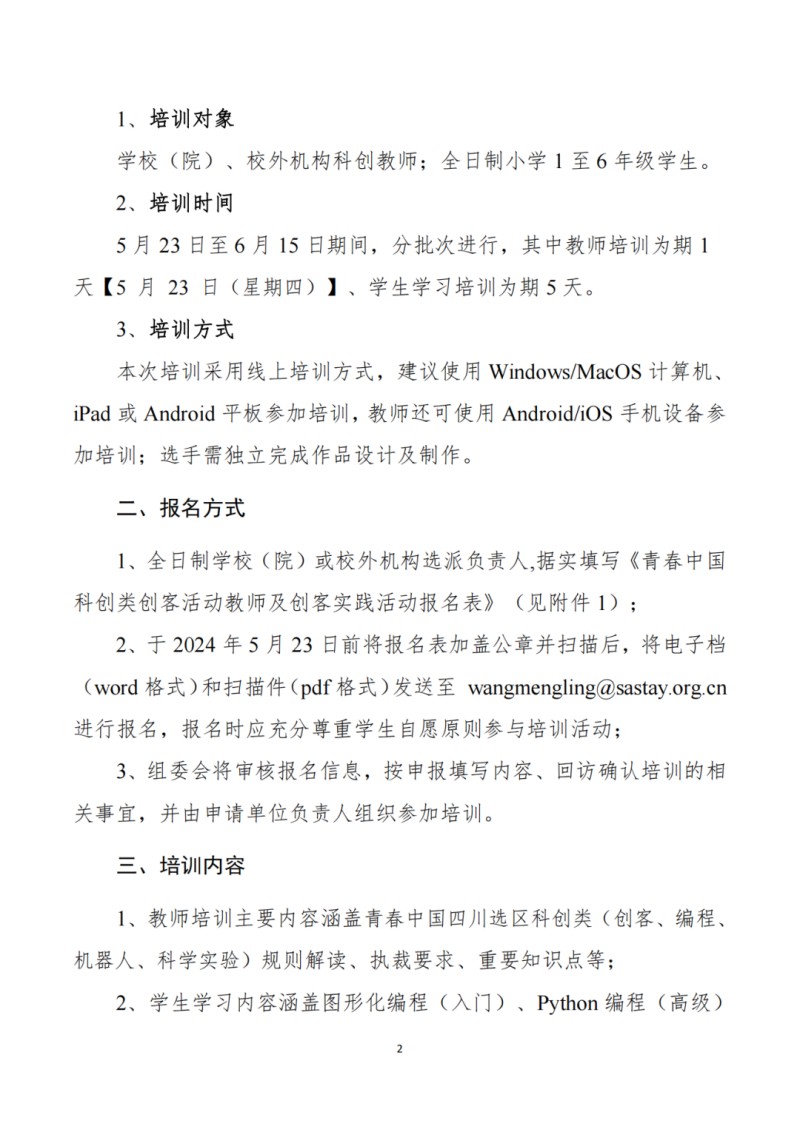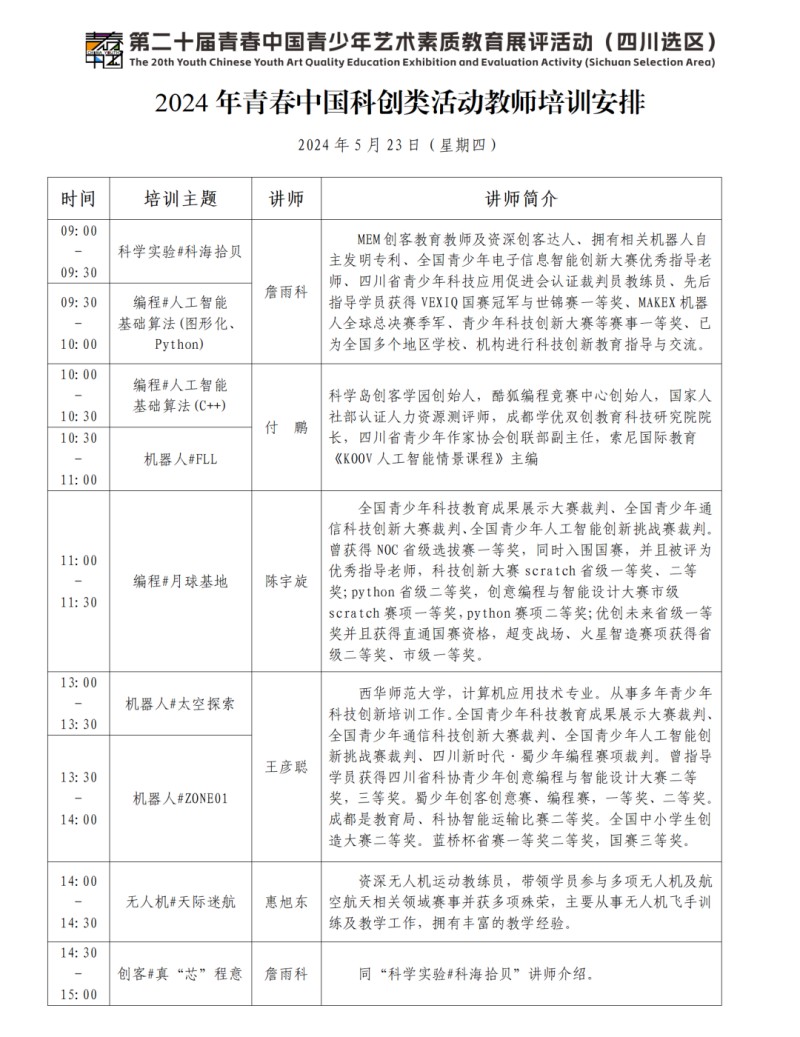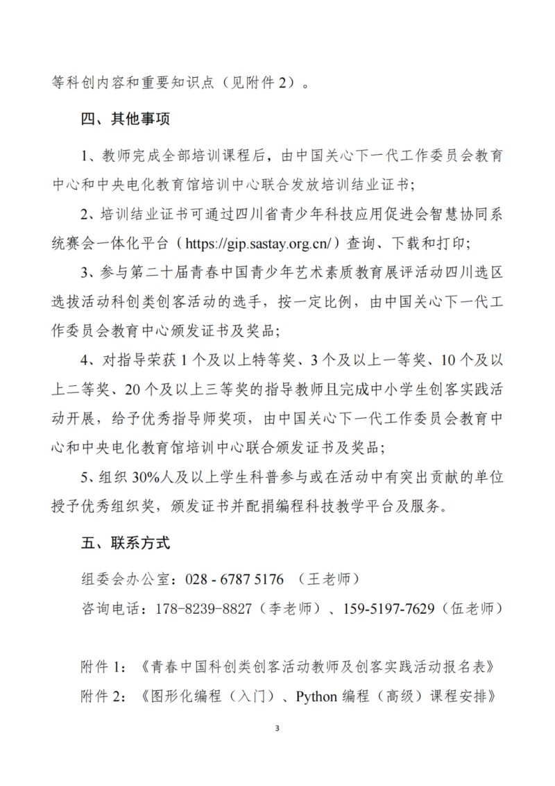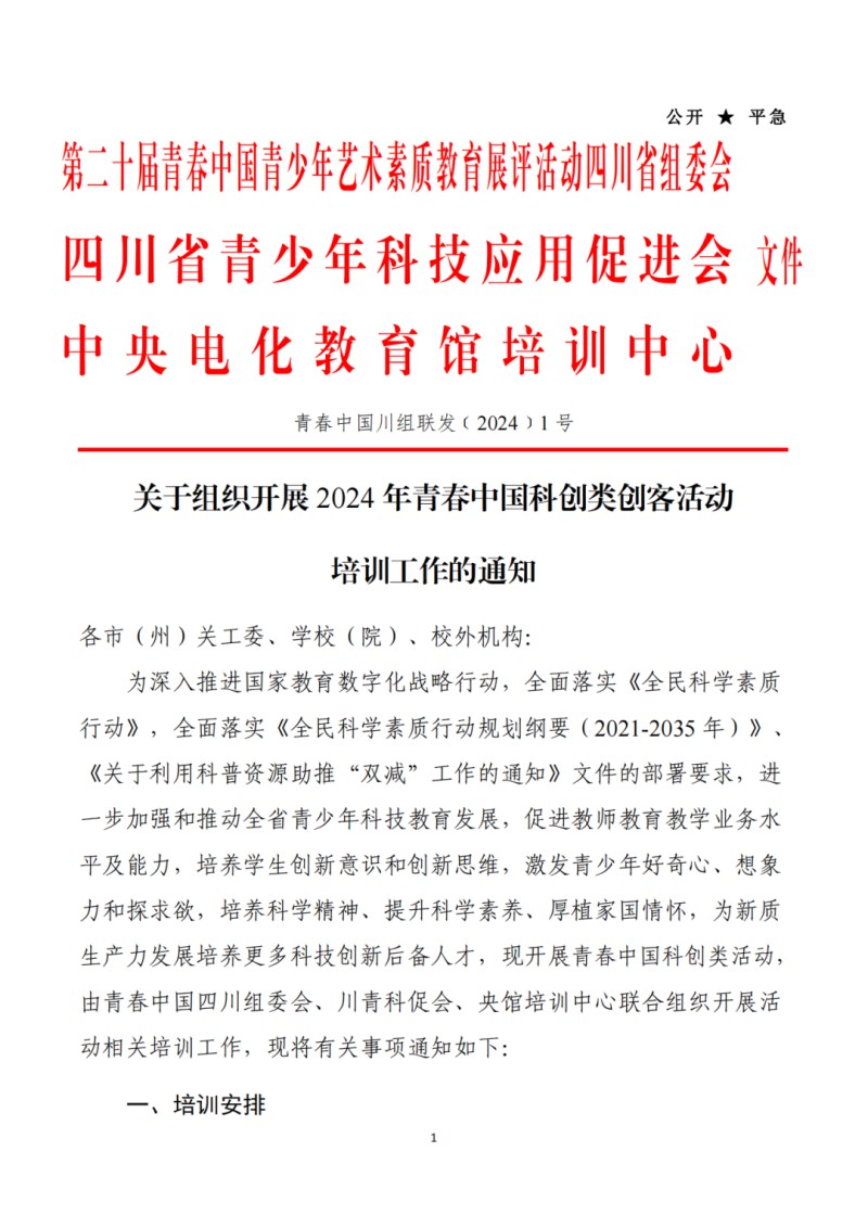 为深入推进国家教育数字化战略行动,全面落实《全民科学素质行动》,全面落实《全民科学素质行动规划纲要(2021-2035年)》、《关于利用科普资源助推“双减”工作的通知》文件的部署要求,进一步加强和推动全省青少年科技教育发展,促进教师教育教学业务水平及能力,培养学生创新意识和创新思维,激发青少年好奇心、想象力和探求欲,培养科学精神、提升科学素养、厚植家国情怀,为新质生产力发展培养更多科技创新后备人才,启动了青春中国科创类活动,经研究,由青春中国四川组委会、川青科促会、央馆培训中心联合开展活动相关培训工作。